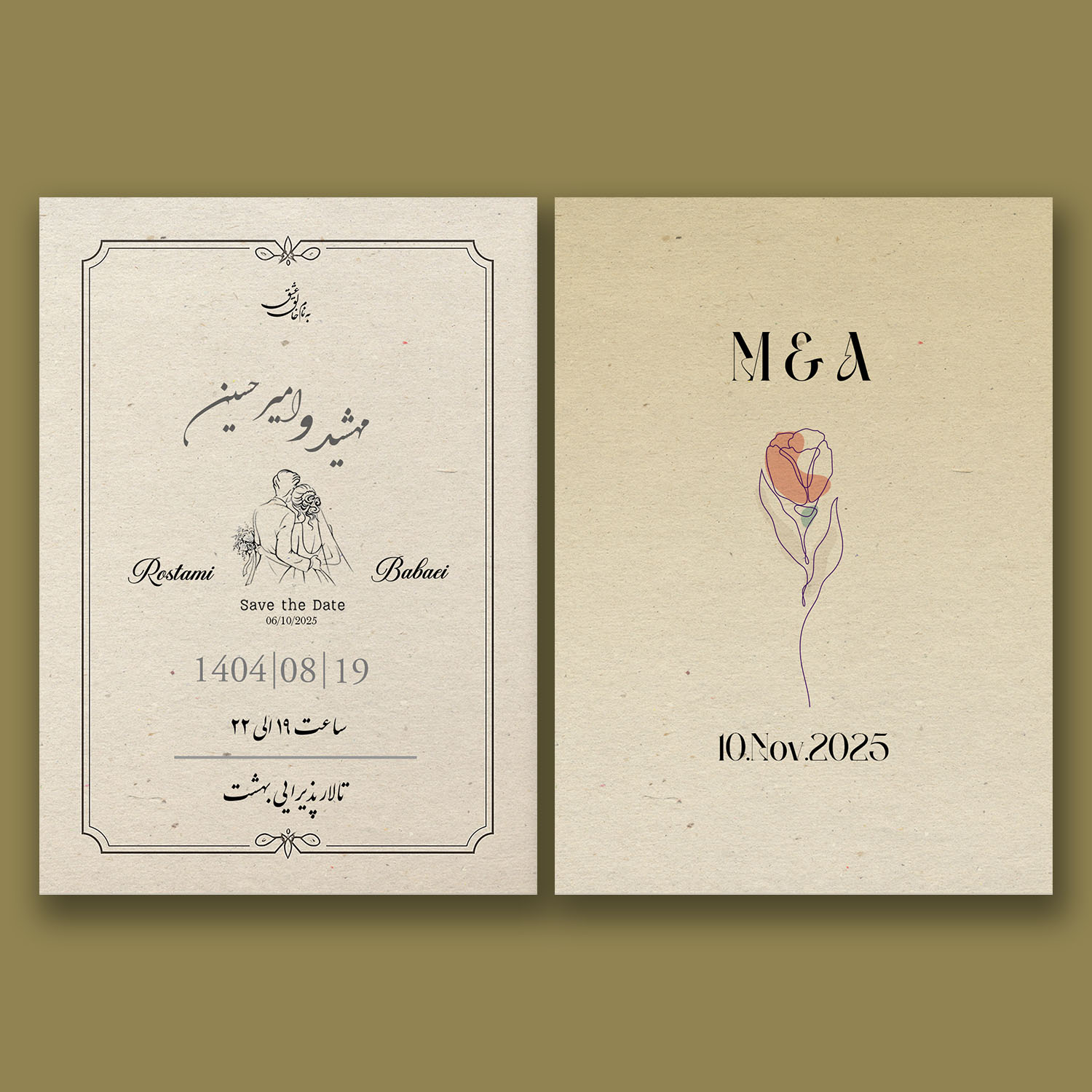کارت عروسی دیجیتال D0431 دو رو با جلوه بصری ویژه، موسیقی قابل تغییر، فرم اعلام حضور مهمانان، مسیریاب آنلاین و ارسال آسان با لینک.