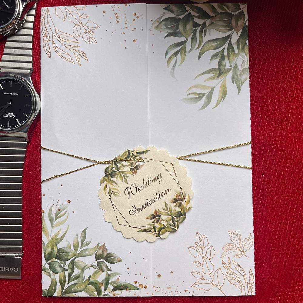 این کارت با ترکیب یک پاکت کالکی با چاپ آبرنگی، فرم چاپ دیجیتال، گل پامپاس سبز و نخ طلایی، یک اثر هنری زیبا را خلق کرده که در عین سادگی، جذابیت زیادی دارد. در ادامه، تمام ویژگیهای این کارت عروسی خاص و دلفریب را بررسی خواهیم کرد.