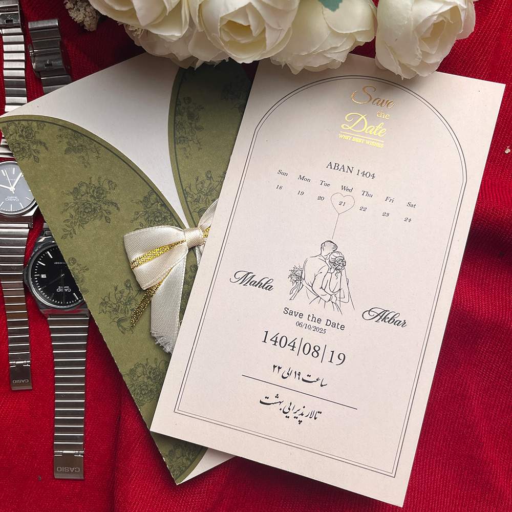 در مجموع، کارت عروسی مدل 1307 با پاکت سبز، برش حلالی، چاپ گل، پاپیون تزئینی و طلاکوب Save the Date یک انتخاب خاص و متفاوت برای زوجهایی است که میخواهند کارت دعوتی شکیل و شخصیسازیشده داشته باشند.