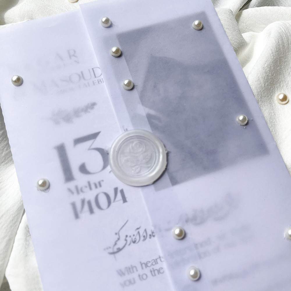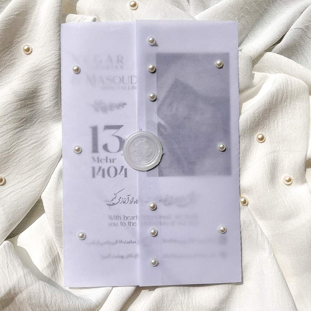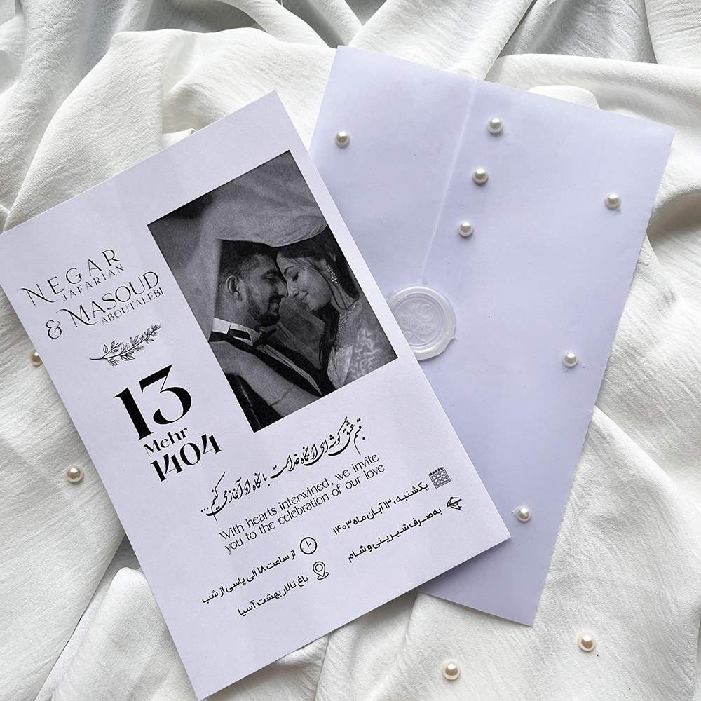 اگر به دنبال کارت عروسی عکسدار، اقتصادی و خاص هستید، کارت M4631 با پاکت کالک، مروارید تزئینی و امکان چاپ اختصاصی عکس عروس و داماد، انتخابی شیک و مدرن است.